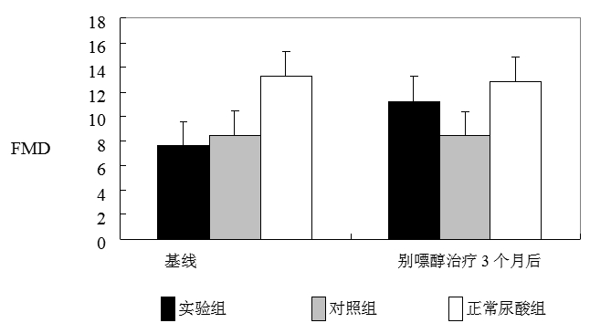| 图 1 3组基线FMD (左)和别嘌醇治疗3个月后(右)FMD情况 Fig 1 FMD at baseline (left) and 3 months after allopurinol treatment (right) in 3 groups |