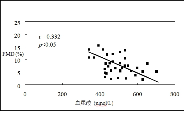 | 图 2 血尿酸和FMD负相关 Fig 2 Negative correlation between serum uric acid and FMD |
