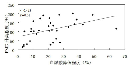 | 图 3 实验组别嘌醇治疗3个月后血尿酸降低程度与FMD升高程度正相关 Fig 3 The decrease of serum uric acid was positively correlated with the increase of FMD in the experimental group after 3 months of allopurinol treatment |