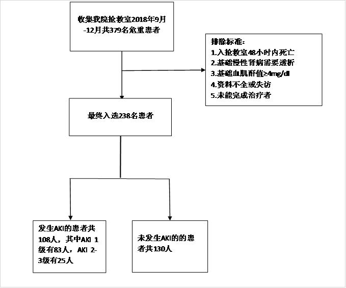 1 资料与方法 1.1 一般资料选择2018年9月至2018年12月收治本院急诊抢救室符合标准的患者238例,入选标准:①年龄>18岁,②住抢救室时间超过24 h,③首次入院,④患者及家属未要求限制性治疗;排除标准:①入抢救室后24 h内死亡;②资料不全或失访;③慢性肾脏病需要透析;④基础肌酐值≥4 mg/dL;⑤未能完成治疗者。