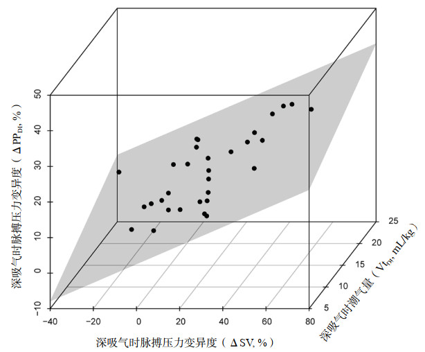 图 1 深吸气时脉搏压力变异度(ΔPPDI)的多元线性回归模型 Fig 1 The multiple linear regression model for pulse pressure variation during deep inspiration |