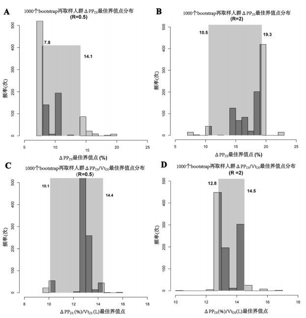 直方图描述了在1 000个bootstrap再取样人群中ΔPPDI和ΔPPDI/VtDI最佳界值点的分布,阴影部分表示这1 000个界值点的95%CI (图A、B、C、D中的数字),即灰区范围 图 4 在开放性液体策略(误分类代价比,R=0.5)和限制性液体策略(误分类代价比,R = 2)时,深吸气时测量的脉搏压力变异度(ΔPPDI)以及经深吸气潮气量(VtDI)校正的ΔPPDI(ΔPPDI/VtDI)预测液体反应性的灰区范围 Fig 4 Gray zones of pulse pressure variation during deep inspiration maneuver (ΔPPDI) and ΔPPDI corrected for tidal volume induced by deep inspiration (ΔVtDI) for a restrictive fluid policy (R= 2; B and D) or a liberal one (R=0.5; A and C) |