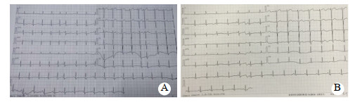 A:窦性心律,偶发房性期前收缩,T波低平(2020-06-19);B:窦性心律,T波低平(2020-06-22) 图 1 患者心电图检查结果 |