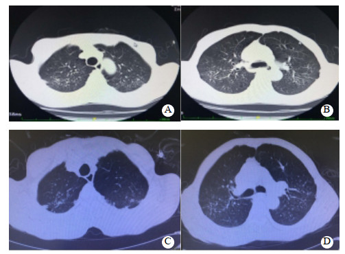 A、B:中毒第5天;C、D:中毒第8天 图 2 患者肺CT结果(示双肺多发纤维增殖灶,慢性支气管炎,肺气肿,双肺多发肺大疱) |