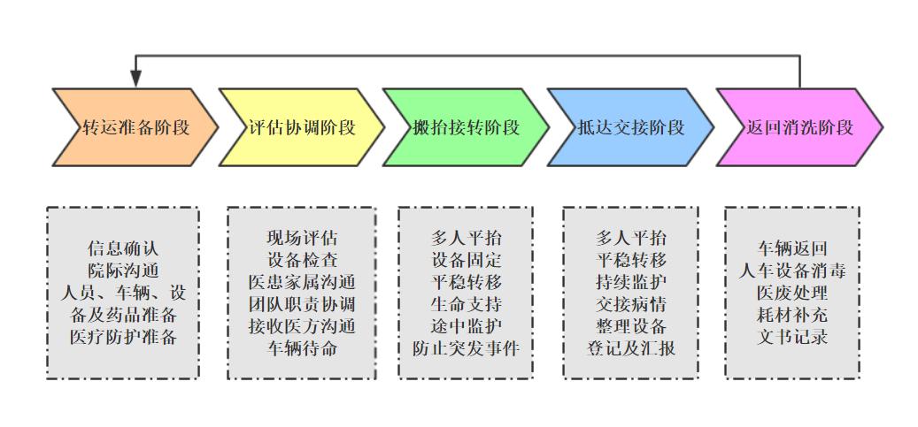 2020年1月1日至2020年5月31日,武汉市急救中心成功转运多例ECMO支持下的重症新冠肺炎患者,未出现一例不良事件,转运团队组成由急救中心ECMO转运医护团队和ECMO医师团队一起协作完成[8]。本研究经伦理委员会审批,批准件号:WHCDCIRB-K-2021023。现总结转运经验,规范各阶段流程,如图 1。
