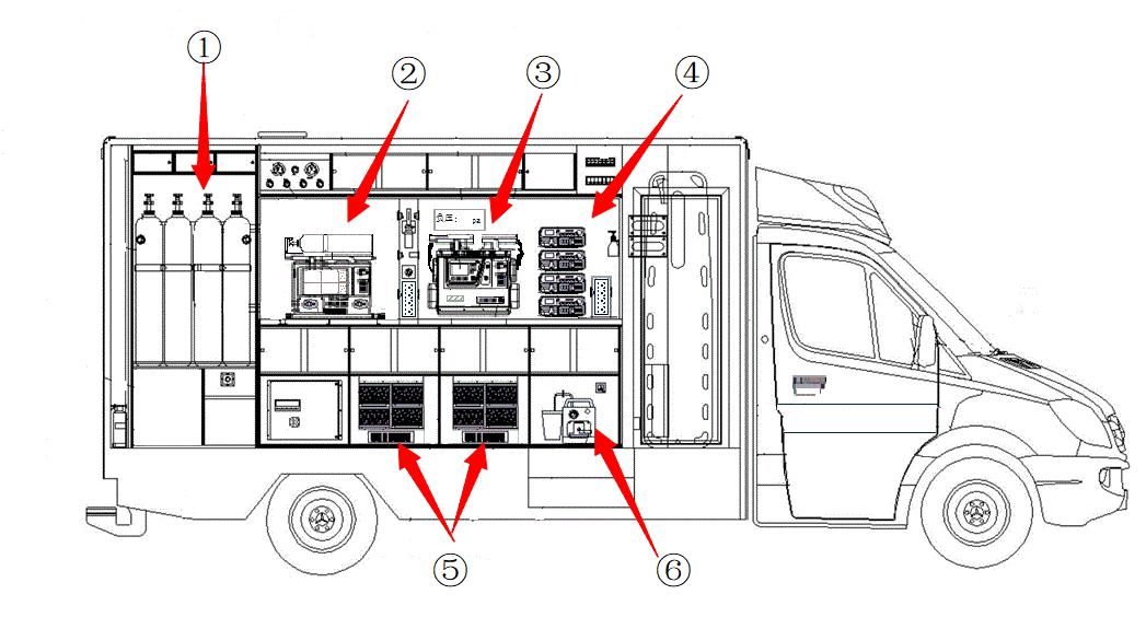 | ① 10 L车载氧气组;②便携式呼吸机及移动氧源;③便携式一体式除颤监护仪;④输液泵组;⑤负压空气过滤系统;⑥便携式吸痰器 图 2 负压救护车车载设备图 |