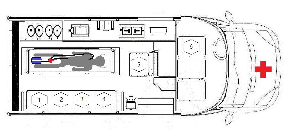 | 1号位:ECMO团队队长,观察并及时调整ECMO主机;2号位:ECMO治疗师,观察ECMO循环泵及静脉管路情况监护患者生命征变化;3号位:急救转运团队护士,负责管理及调整输液、氧气、吸痰、微量泵的使用,在ECMO治疗医师指导下进行药物使用;4号位:ECMO呼吸治疗师,观察并管理患者气道,监控机械通气情况;5号位:急救转运医师,总体协调患者转运事宜的管控;6号位:急救转运团队驾驶员 图 4 负压救护车随车人员分布的平面图 |