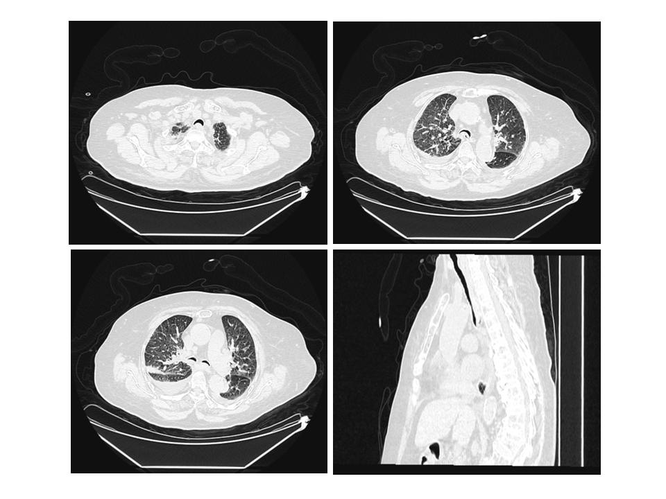 第一次就诊(2020年12月24日):因“阵发性胸闷气促2个月余,加重2 h”呼叫120送来本院就诊。患者近2个月内胸闷气促反复发作,活动后加剧。120到达现场时患者症状已好转。查体:神志清,血压165/92 mmHg(1 mmHg=0.133 kPa),脉搏血氧饱和度93%,呼吸23次/min。肥胖体型,面色无发绀,双肺呼吸音减低,未闻及干湿啰音及哮鸣音。心率110次/min,律规整。急查血常规:白细胞7.77×109/L,中性粒细胞百分比65.6%,床边肌钙蛋白Ⅰ 0.01 ng/mL,高敏肌钙蛋白T 20.4 pg/mL,血钾3.9 mmol/L,血钠132.6 mmol/L,血肌酐89 μ mol/L,血糖7.6 mmol/L。血气分析:pH 7.382,PaO2 68 mmHg,PaCO2 55 mmHg。心电图示:窦性心律,偶发室早。胸部CT平扫(图 1)示:(1)气管、主支气管及其分支退变,气管及双侧主支气管塌陷;(2)双肺慢性支气管炎,双肺多发间质性炎症,双侧胸腔少量积液;(3)左肺上叶前段实性结节,增殖灶可能。右肺上叶尖段及左肺下叶外基底段钙化灶;(4)纵隔及右肺门数枚淋巴结,部分增大。考虑慢性阻塞性肺疾病急性加重期,给予布地奈德雾化吸入、抗感染、平喘对症处理。8 h后患者症状缓解,自行出院。