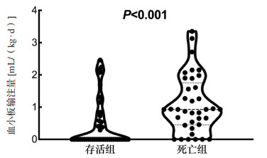图 1 生存组及死亡组血小板输注量小提琴图 Fig 1 Violin plot of platelet transfusion volume between the survival and death groups |