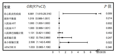 目前对于成人ECMO患者血小板的输注阈值尚无统一标准,研究表明[9, 16-17],大多数用于ECMO患者的血小板输注都是预防性的,以达到预先设定的阈值。笔者采用的血小板输血阈值为50× 109/L。在本研究模型中,血小板输注量是VA-ECMO患者的危险因素,一方面,血小板输注量的升高提示患者处于较低的血小板计数水平,相应发生出血的风险大大增加,另一方面,较低的血小板计数提示患者有感染的可能,而出血和感染是ECMO患者常见且致命的并发症。此外,大量输血可能会导致输血相关急性肺损伤(TRALI)、输血相关心脏过载(TACO)、输血相关的免疫调节异常(TRIM) 等[18-20],越来越多的证据提示限制性输血策略可能会改善重症患者的预后[21-22]。