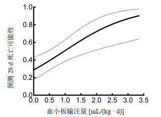 图 3 ECMO上机后血小板输血量对28 d死亡的预测概率 Fig 3 Predictive probability of 28-day mortality as a function of PLT transfusion volume during ECMO treatment |