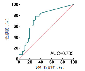 血小板输注量预测患者死亡的曲线下面积(AUC)为0.735;当最佳临界值为0.43 mL/(kg · d) 时,敏感度为78.4%,特异性为69.6%(表 2,图 3)。