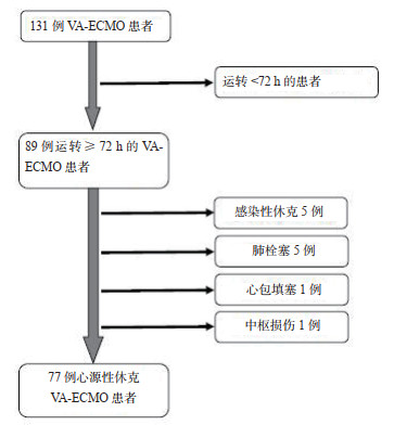 2 结果共回顾131例VA-ECMO患者。筛选出运转≥72h的VA-ECMO病例共89例。排除感染性休克5例,肺栓塞5例,心包填塞1例,中枢损伤1例。最终入选心源性休克患者77例。见图 1。