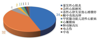 77名入选患者中,暴发性心肌炎34例(44.2%),急性心肌梗死32例(41.6%),恶性心律失常致心搏骤停4例(5.2%),酸中毒致高钾2例(2.6%),甲状腺功能亢进性心脏病1例(1.30%),心瓣膜病1例(1.30%),肺动脉高压1例(1.30%),电击伤1例(1.30%),中毒1例(1.30%)。见图 2。