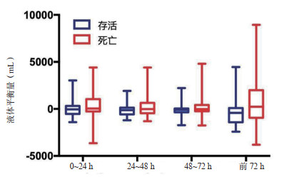 存活患者前72h中每24h容量平衡分别为-45(-530,321)mL,-132(-577,132)mL,-107(-354,39)mL,前72h总平衡-420(-1419,93)mL;死亡患者前72h中每24h容量平衡分别为46(-266, 1 047)mL,-24(-458,646)mL,-15(-247,425)mL,前72h总平衡234(-948,1 996)mL。经Mann-Whitney U检验,48~72 h容量平衡(P=0.039)和前72 h总容量平衡(P=0.017)两组之间差异有统计学意义。见图 3。