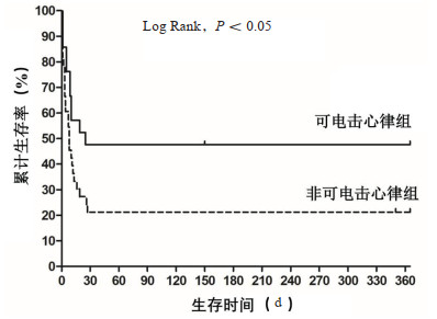 图 2 可电击心律组与非可电击心律组的1年预后比较 Fig 2 Comparison of 1-year prognosis between the shockable and unshockable initial rhythm groups |