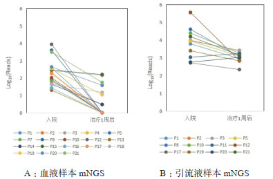 检测结果为阴性时认定Reads数为0,纵坐标为Log10(Reads)。18例患者完成2次血液样本检测,12例患者完成2次引流液样本检测,配对数据以直线连接。 图 1 治疗前后血液样本(A)和引流液样本(B)mNGS检出致病病原体Reads数变化 Fig 1 Changes of the number of Reads in blood sample (A) and drainage fluid sample (B) before and after treatment |