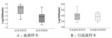 A:血培养阳性组患者血液样本mNGS检出致病病原体Reads显著高于血培养阴性组,P<0.05。B:引流液培养阳性组与阴性组之间,引流液样本mNGS检出致病病原体Reads数差异无统计学意义,P=0.116。 图 2 常规微生物培养结果阳性、阴性两组中mNGS检出致病病原体Reads数的对比 Fig 2 Comparison of the number of pathogenic Reads detected by mNGS in the positive and negative groups of routine microbial culture |