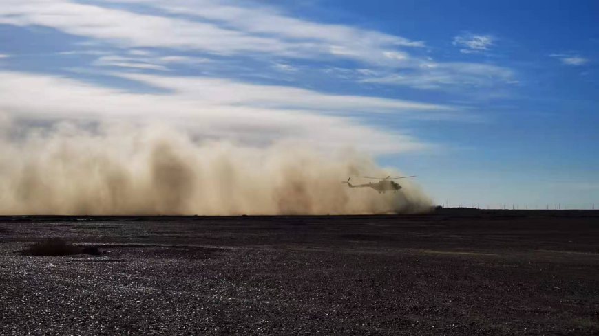 图 2 主着陆场荒漠地形与直升机降落时扬起的沙尘 Fig 2 The desert terrain of the main landing area and the dust kicked up by the helicopter landing |