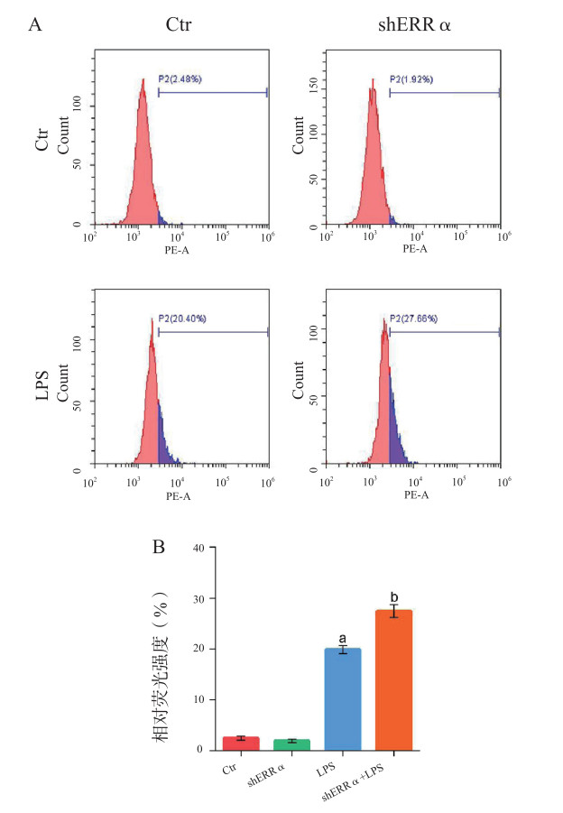A:流式细胞术测定四组细胞内荧光强度,正常细胞内ROS含量较低,荧光较弱,峰值偏左;ROS阳性细胞胞中荧光明显增强,PE藻红蛋白峰发生右移。B:根据三次实验,定量分析四组细胞内ROS相对荧光强度,与Ctr和shERRα组比较,aP < 0.01;与LPS组比较,bP < 0.05 图 1 ROS荧光检测试剂盒测RPMVECs内ROS的水平 Fig 1 The level of ROS in RPMVECs measured by ROS fluorescence kit |