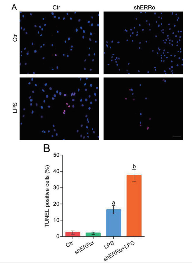 如图 2,细胞TUNEL实验结果显示,Ctr组和shERRα组未观察到明显红色荧光,而LPS处理后的RPMVECs观察到有TUNEL阳性细胞(16.44±2.55,P < 0.05),而shERRα+LPS组细胞总数减少,同时TUNEL阳性细胞数比例明显增加(37.45±3.79,P < 0.05)。