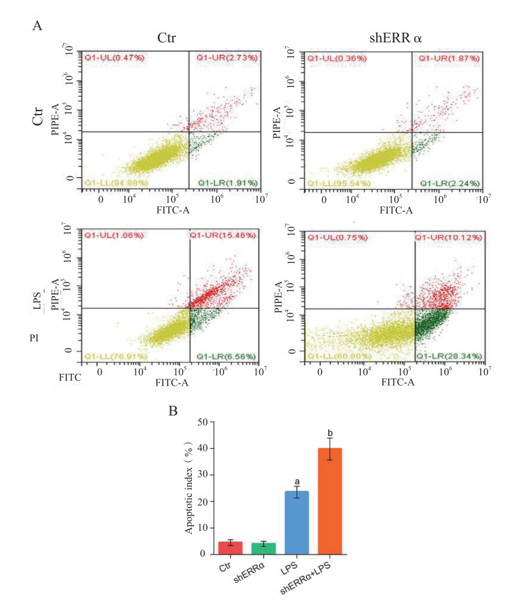 A:Annexin-V阳性、PI阴性为早期凋亡细胞,Annexin-V、PI双阳性为晚期凋亡细胞。B:根据三次实验,定量分析四组细胞的总凋亡率。与Ctr和shERRα组比较,aP<0.01;与LPS组比较,bP0.05 图 3 流式细胞术检测细胞凋亡情况 Fig 3 The cell apoptosis detected by flow cytometry |