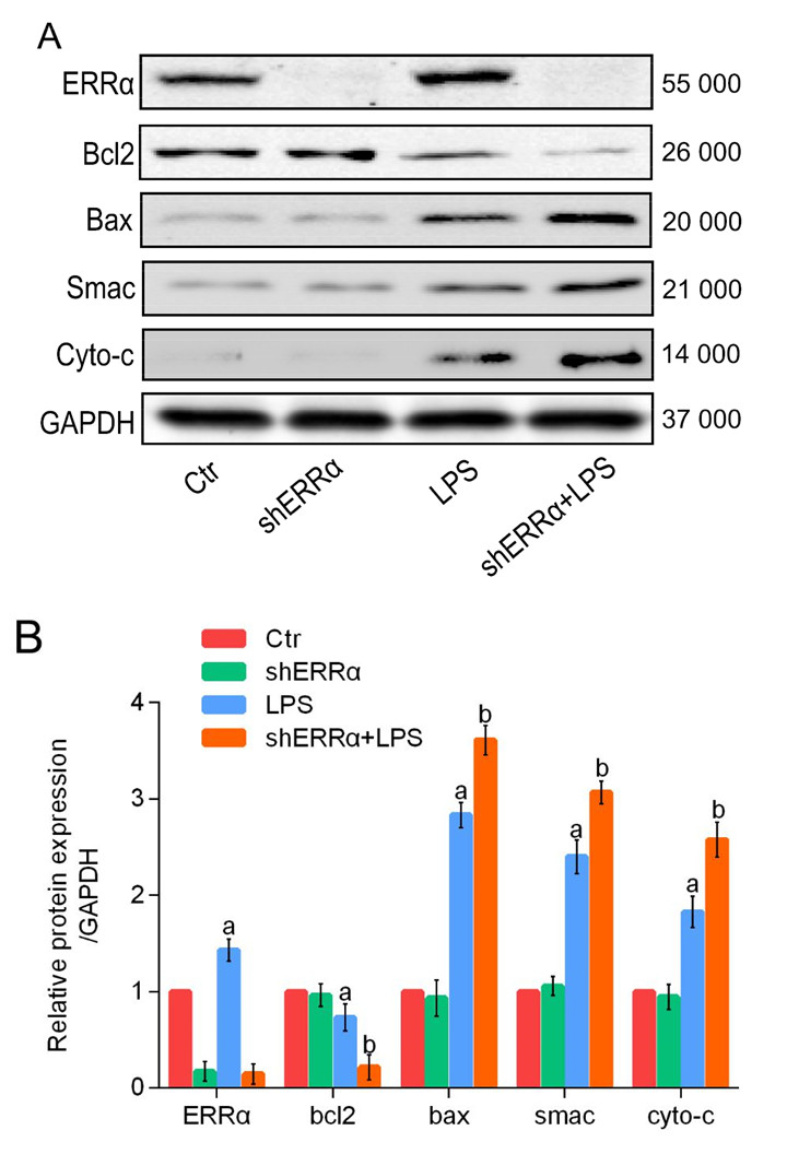 A:四组细胞ERRα、Bax、Bcl2、Cyto-c和Smac代表性的表达情况。B:相关蛋白与GAPDH灰度值相比的定量分析结果。与Ctr和shERRα组比较,aP<0.01;与LPS组比较,bP<0.05 图 4 Western Blot检测线粒体凋亡相关蛋白的表达 Fig 4 The expression of mitochondrial apoptosis-related proteins detected by Western blot. |