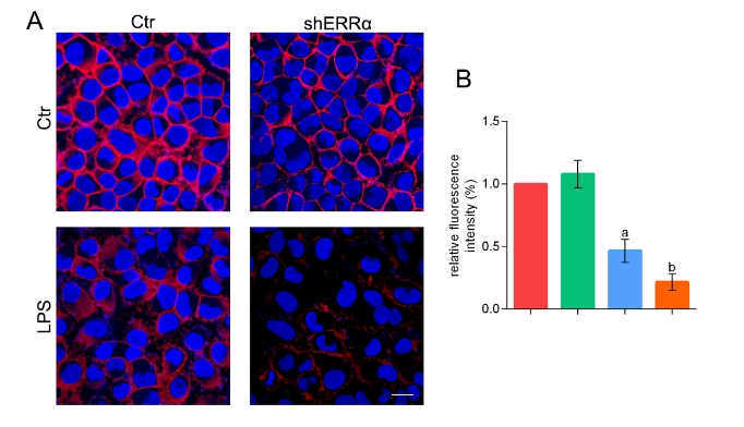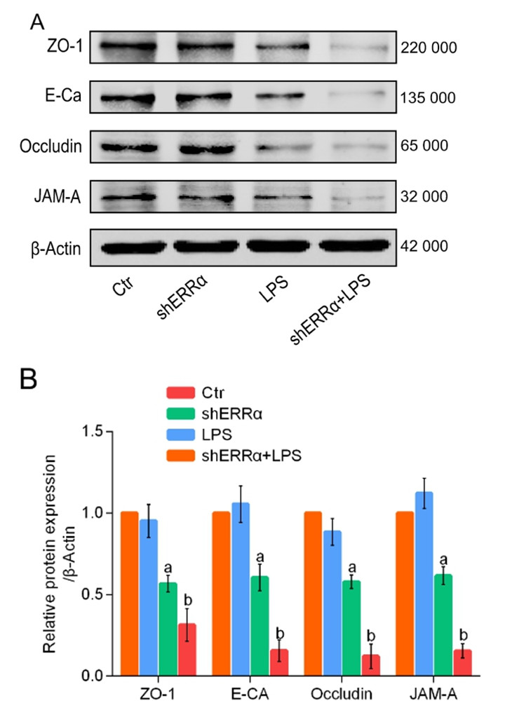 A:四组细胞ZO-1、E-Ca、Occludin和JAM-A代表性的表达情况。B:相关蛋白与β-Actin灰度值相比的定量分析结果。与Ctr和shERRα组比较,aP<0.01;与LPS组比较,bP<0.05 图 6 Western Blot检测细胞连接相关蛋白的表达 Fig 6 The expression of junction-related proteins detected by Western blot. |
