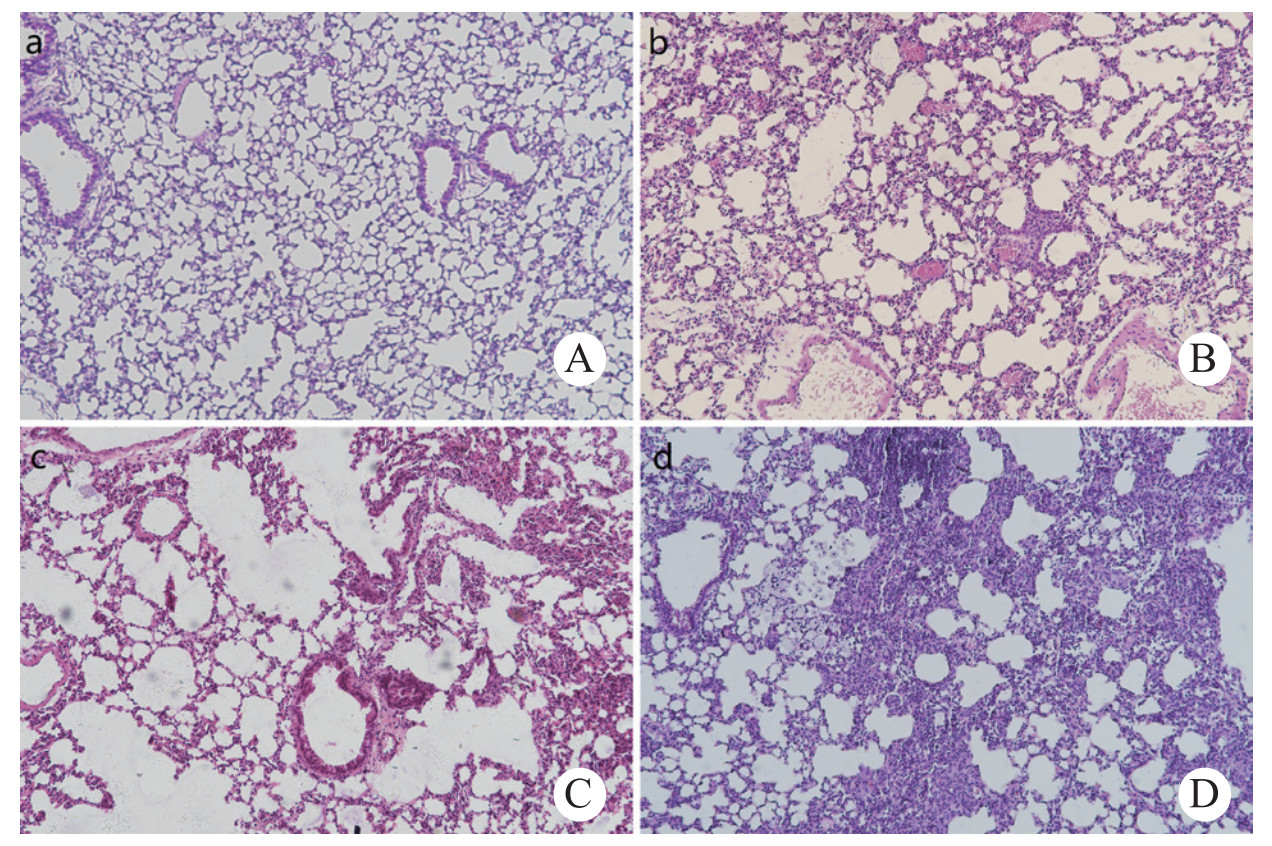 1.2.2 苏木精-伊红(hematoxylin-eosin,HE)染色经石蜡包埋后的肺组织切成5 μm厚的切片,进行HE染色并光镜下观察肺脏的病理改变。