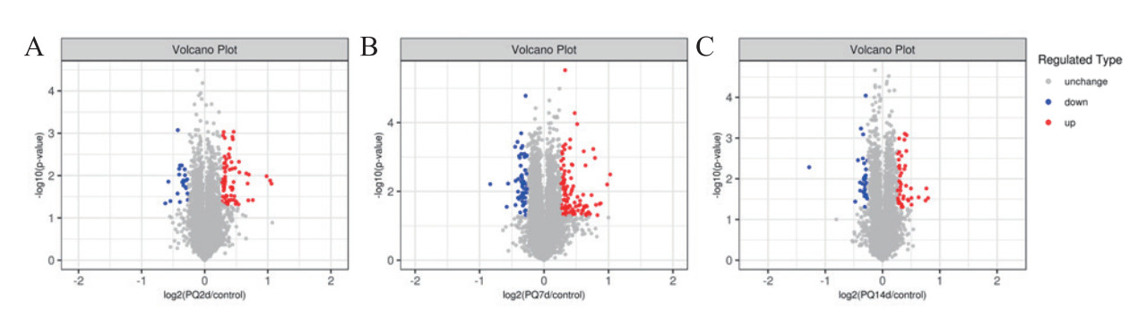 A: PQ-2d vs Control组,B: PQ-7d vs Control组,C: PQ-14d vs Control组 图 2 差异蛋白表达火山图 Fig 2 Volcano plot of the differentially-expressed proteins |
