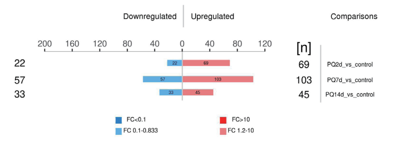 与对照组小鼠肺脏蛋白表达比较,蛋白差异表达的火山图见图 2,PQ-2d组中91个蛋白的表达差异有统计学意义,其中69个蛋白表达升高[表达差异倍数(Fold change, FC) > 1.2且P < 0.05,下同],22个蛋白表达降低(FC < 0.83且P < 0.05,下同);PQ-7 d组中有160个蛋白的差异表达有统计学意义,其中103个蛋白表达升高,57个蛋白表达降低;PQ-14 d组中有78个蛋白的差异表达有统计学意义,其中45个蛋白表达升高,33个蛋白表达降低(图 3)。这些结果提示:PQ中毒所致肺损伤过程中差异蛋白以升高为主,且在染毒7 d时,差异表达的蛋白数量最多。