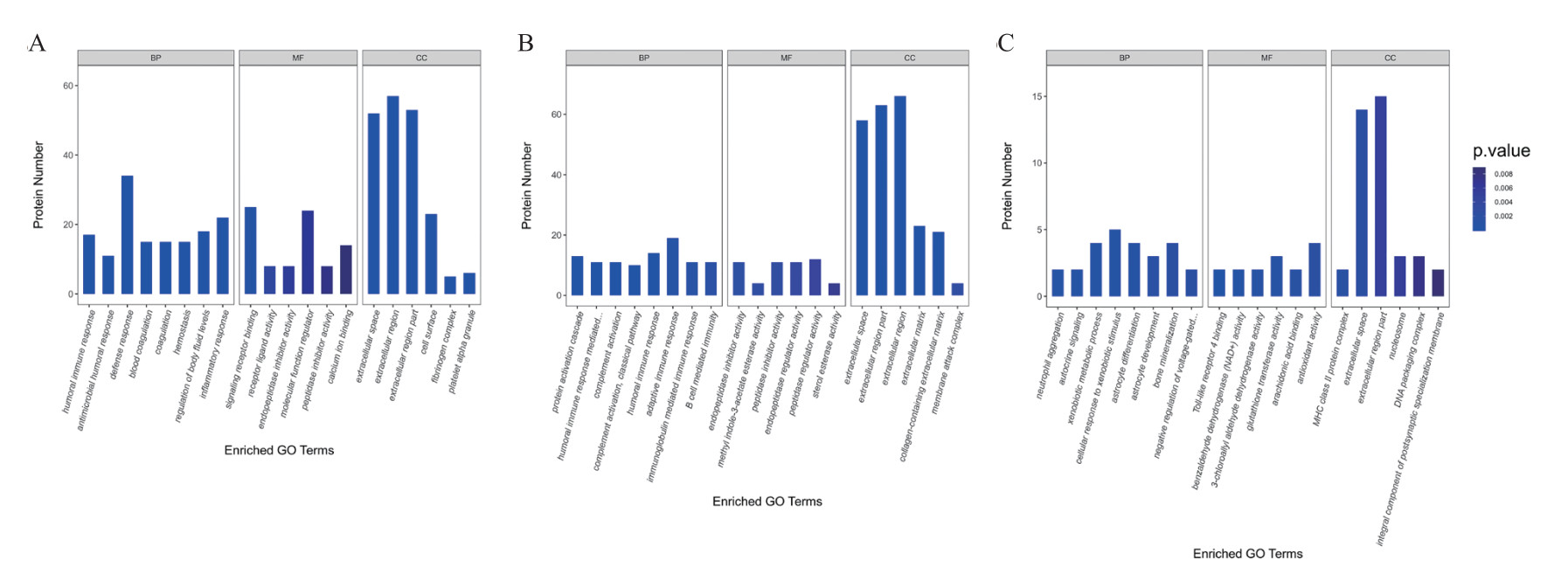A: PQ-2 d vs Control组;B: PQ-7 d vs Control组;C: PQ-14 d vs Control组 图 5 显著差异蛋白GO功能注释图 Fig 5 Gene ontology function annotation of differentially-expressed proteins |