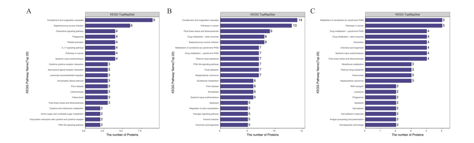与对照组相比,PQ-2 d组91个差异蛋白一共匹配到115条KEGG通路,其中14条通路在PQ处理下所受的影响显著且有统计学意义(图 6A),其中补体和凝血级联(富集到9个差异蛋白,前五个分别为:补体C3、纤溶酶原、补体C4b、凝血因子Ⅲ、蛋白C受体)通路中差异表达的蛋白数量最多。PQ-7 d组的160个显著差异蛋白一共匹配到164条KEGG通路,其中23条通路在PQ处理下所受的影响显著且有统计学意义(图 6B),其中补体和凝血级联(富集到14个差异蛋白,前五个分别为:丝氨酸蛋白酶抑制剂A1b、补体C8b、纤溶酶原、补体成分因子i、补体C1qb)通路中差异表达的蛋白数量最多。PQ-14 d组中78个显著差异蛋白一共匹配到97条KEGG通路,其中13条通路在PQ处理下所受的影响显著且有统计学意义(图 6C),其中Metabolism of xenobiotics by cytochrome P450(富集到5个差异蛋白, 分别为:cytochrome P450 2f2、glutathione S-transferase a3、aldehyde dehydrogenase 3a1、glutathione S-transferase a2 (Yc2)、glutathione S-transferase m6)通路中差异表达的蛋白数量最多。这些结果表明补体和凝血途径(Complement and coagulation cascades)在PQ中毒肺损伤早期(2 d、7 d)起重要作用,而到中后期(14 d)差异蛋白主要在代谢途径中发挥重要作用。
