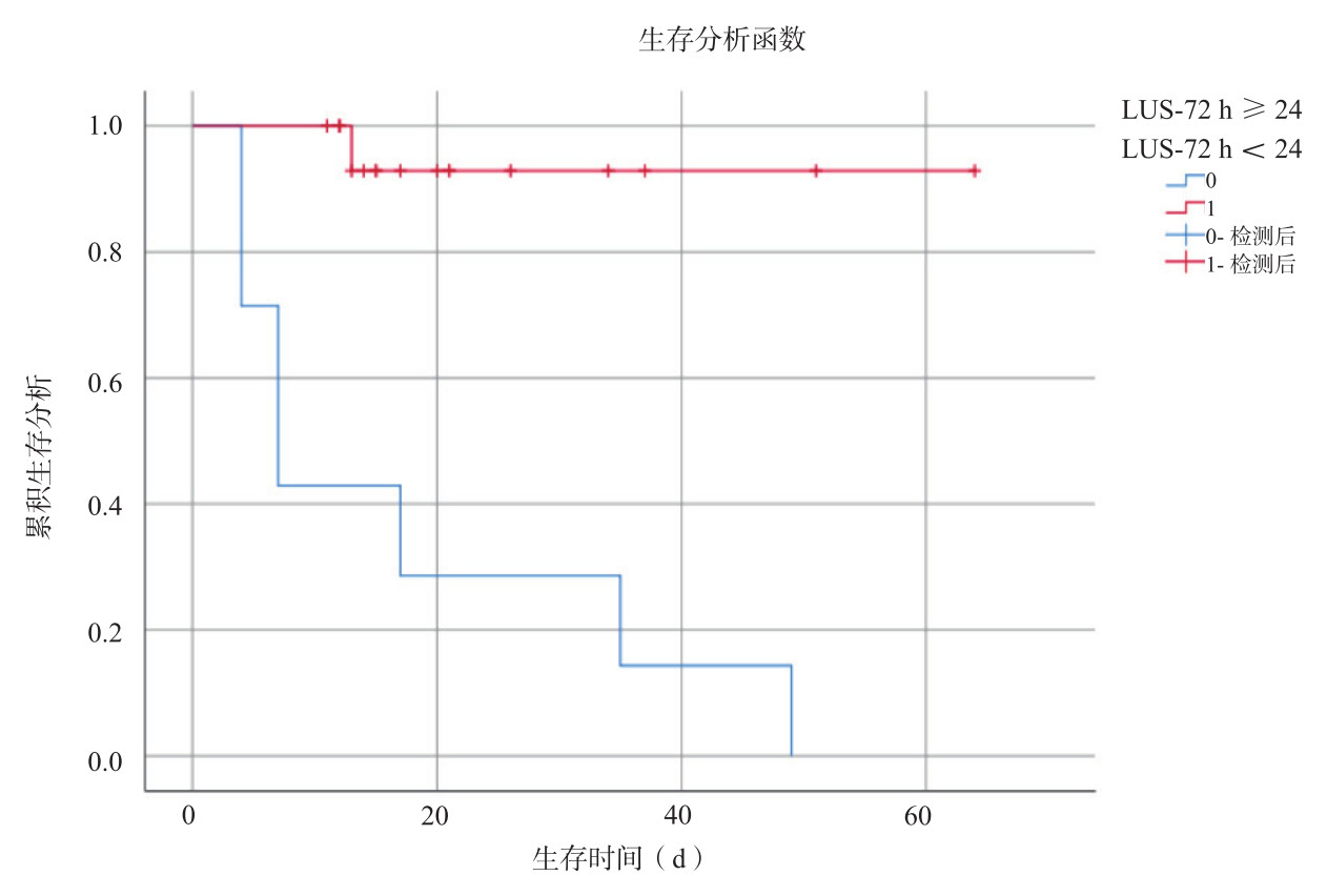 图 2 Kaplan-Meier生存曲线对比LUS-72 h≥24 vs LUS-72 h < 24重度ARDS患儿的PICU生存状态 Fig 2 Kaplan-Meier survival curve compared PICU survival status of LUS-72h≥24 vs LUS-72 h < 24 in children with severe ARDS |