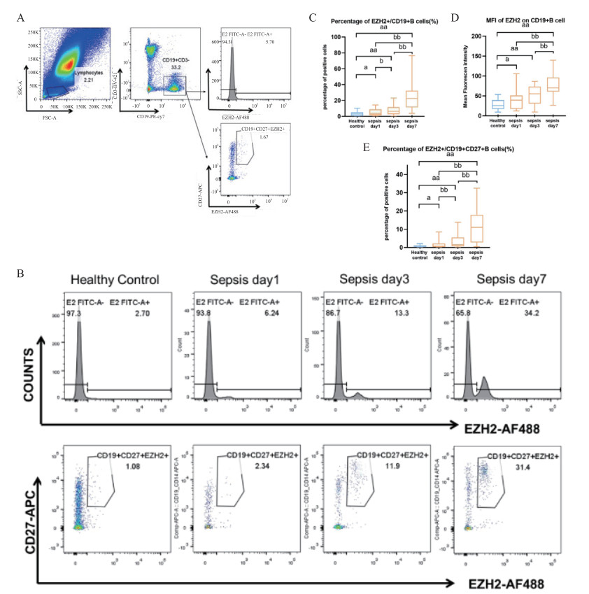 综上所述,本研究初步发现了脓毒症患者外周血B淋巴细胞上EZH2上调与脓毒症患者不良预后相关。未来的研究将着眼于通过体内外模型,验证EZH2调控脓毒症B细胞分化和功能的作用及其潜在机制。本研究样本量小,为单中心研究,需要进一步扩大样本量,进行多中心研究进一步验证结论。