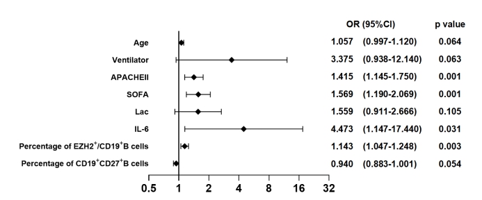脓毒症组28 d死亡危险因素的多因素logistic回归分析提示,脓毒症患者第1天指标中APACHEⅡ评分、SOFA评分、CD19+B淋巴细胞上EZH2阳性率、IL-6(图 2)为其独立危险因素(P < 0.05);患者年龄、是否使用呼吸机、早期乳酸、早期CD19+CD27+细胞的百分比计数与患者28 d预后无关(P > 0.05)。