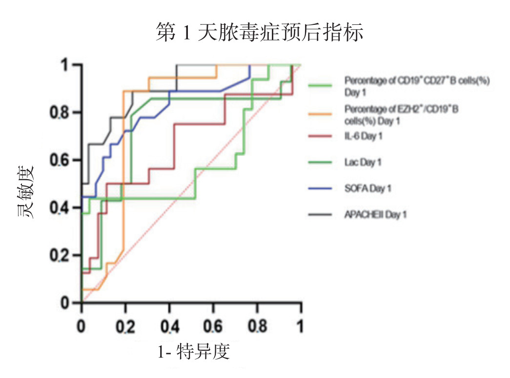 为了明确EZH2对于脓毒症患者预后的判断价值,本研究进一步分析了存活组和死亡组之间CD19+B淋巴细胞及CD19+CD27+B细胞亚群EZH2表达的差异,结果显示脓毒症患者死亡组第1天CD19+ B细胞上EZH2的表达明显高于存活组,是预测患者28 d死亡的独立危险因素,死亡的预测效力上灵敏度优于SOFA评分,特异度高于APACHE Ⅱ评分,还有待扩大样本量进一步验证。此外,本研究还发现存活组第3、7天CD19+CD27+B细胞上EZH2的表达明显高于死亡组(P < 0.05),这提示我们不同预后的脓毒症患者免疫调控后期CD19+CD27+B细胞上EZH2的表达之间存在差异,由于CD19+CD27+B细胞可以快速召集抗体对感染产生免疫应答,此时免疫功能尚可的患者CD19+CD27+B细胞数目相对较多,预后相对较好,而存活患者CD19+CD27+B细胞EZH2升高是否与促进CD19+CD27+B细胞募集分泌抗体,控制感染相关及其潜在的可能机制尚待进一步体外实验的功能验证研究探索。