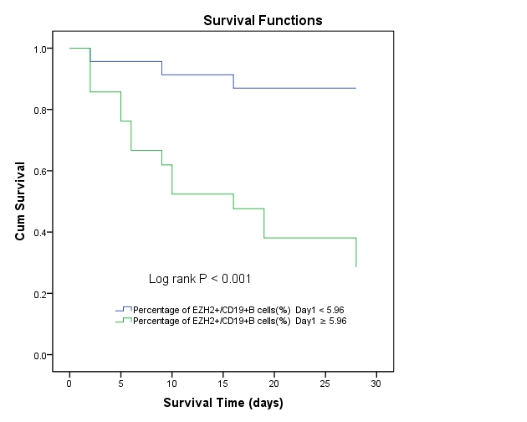 图 4 根据CD19+B淋巴细胞上EZH2百分比绘制脓毒症患者生存曲线 Fig 4 Survival curves of septic patients according to the percentage of EZH2 on CD19+B lymphocytes |