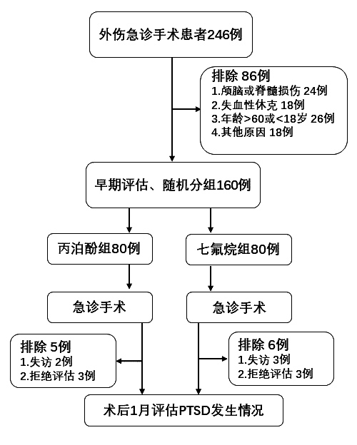 创伤后应激障碍(post-traumatic stress disorder,PTSD)是指个体经历异乎寻常的威胁性、灾难性事件后出现的一系列特征性症状:反复重现创伤性体验、持续的警觉性增高、对与刺激相似或有关的情境回避症状群。近年来,由于交通事故、自然灾害、战争、恐怖暴力等事件频发,经历创伤性事件后人群PTSD发病率高达10%~22%[1-2],给患者、家庭和社会造成了大量的人力、物力消耗[3]。值得关注的是,车祸、地震、高空坠落等创伤性事件中伴有躯体创伤的患者往往需要在早期接受急诊手术治疗或重症监护,不可避免地使用作用于中枢神经系统的麻醉镇静药物,如最为常用的丙泊酚。PTSD一旦形成很难治愈,其中一个重要原因是条件化的恐惧记忆异常强化而难以消退[4]。这些患者在恐惧记忆尚未牢固的巩固阶段使用全身麻醉药物是否会影响PTSD发生率是值得关注的问题。本研究旨在探讨两种主要全身麻醉药物丙泊酚、七氟烷对急诊外伤患者术后PTSD发病率的影响,为临床合理选用麻醉药物、预防PTSD提供有力的理论依据。