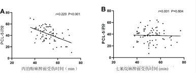 对两组患者麻醉前受伤时间与PCL-5评分的相关性进行Spearman分析,结果显示丙泊酚组患者麻醉前受伤时间与PCL-5评分程负相关(r=0.229, P < 0.01),七氟烷组患者麻醉前受伤时间与PCL-5评分无显著负相关性(r=0.001, P=0.804)。见图 2。