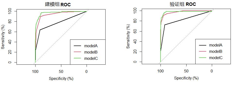 模型 | AUC | Cut-off值 | 特异度(%) | 敏感度(%) | P (与A相比) | P (与B相比) |