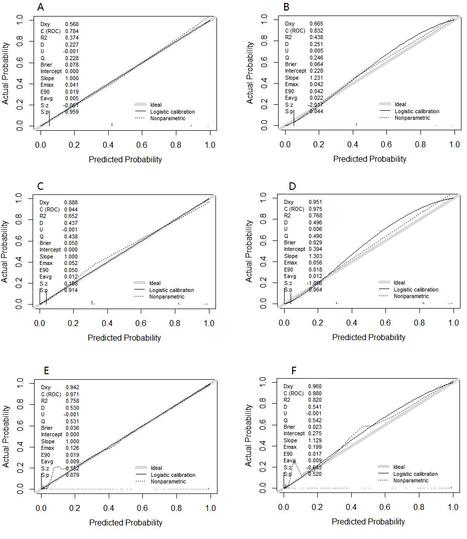 A:建模组模型A;B:验证组模型A;C:建模组模型B;D:验证组模型B;E:建模组模型C;F:验证组模型C 图 2 各预测模型的校准图 Fig 2 Calibration plot for each predictive model |