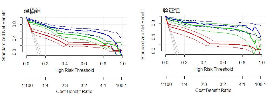 绘制建模组及验证组的各诊断模型预测脓毒症的决策曲线,模型B及模型C的净效益均优于模型A(图 3)。