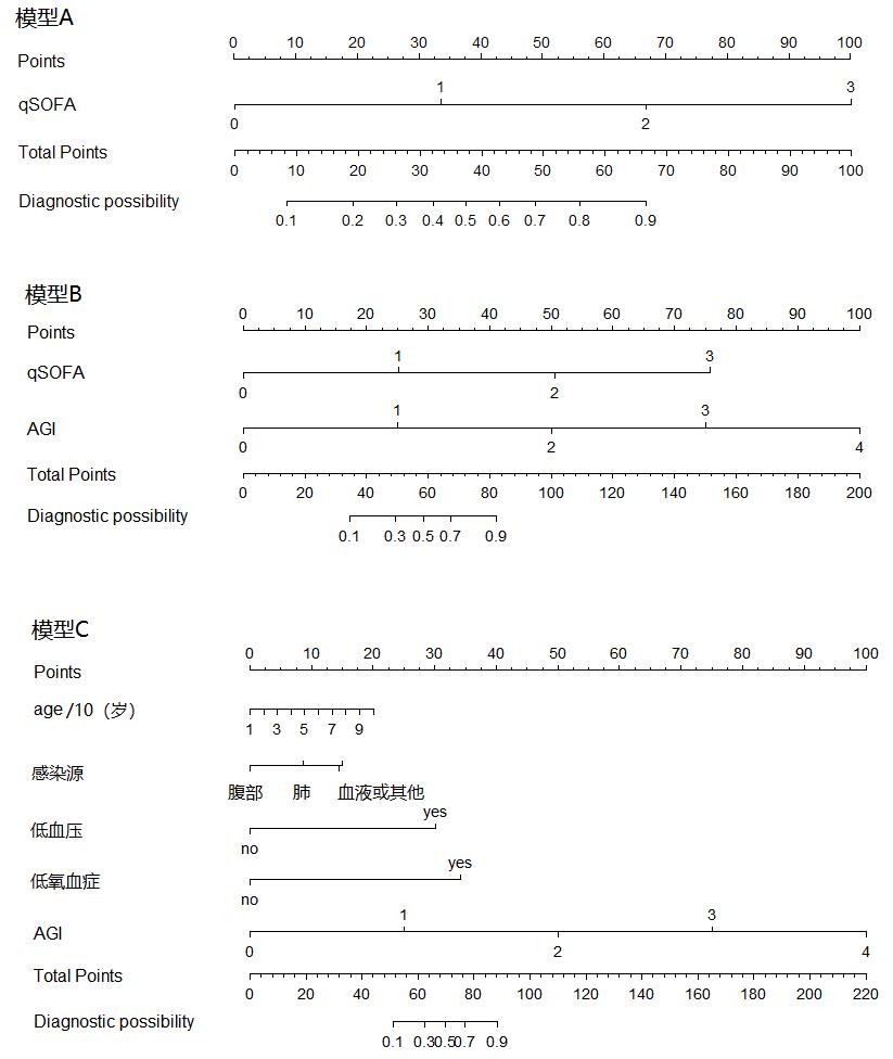 既往有研究将AGI分级联合SOFA评分来提高对疾病预后的预测价值。王玲玲等[15]发现通过AGI分级联合SOFA评分可提高老年脓毒症患者预后的预测价值,SOFAmax+AGImax值为14时预测预后的敏感度为67.65%,特异度为87.72%。在急性重症胰腺炎的患者中将AGI分级系统引入SOFA评分,绘制预测预后的ROC曲线,显示SOFA+AGI评分的AUC为0.963±0.037(95%CI 0.882~0.994), 明显高于APACHEⅡ评分及SOFA评分(P=0.013, 0.008),3种评分系统中以SOFA+AGI的Youden指数和阳性似然比最大,分别为0.863和15.38[16]。但将AGI分级应用在脓毒症筛选中的报道并不多,本研究通过AGI分级联合qSOFA评分(模型B)对普通病房的感染患者进行筛选,与qSOFA相比提高了预测脓毒症的敏感性,且特异度并无明显下降。此模型在验证组中得到了验证,ROC曲线分析显示模型B其诊断价值明显高于qSOFA,而和模型C之间无明显差异,校准图提示qSOFA的精确性低,有遗漏诊断脓毒症的风险,模型B的精确度相对更好。决策曲线分析也显示模型B及模型C的净效益均优于模型A。模型B的相关参数均是可在普通病房获得的简易指标,提高了其在临床的应用性。最后根据预测模型绘制各模型的列线图,便于操作及临床推广应用。