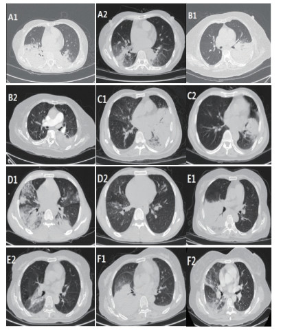 A1、A2;B1、B2;C1、C2;D1、D2;E1、E2;F1、F2分别为病例1~6患者治疗前后胸部CT变化情况,患者表现为大片状实变影,经治疗后胸部CT可见病灶明显吸收。 图 1 6例患者胸部CT表现 |