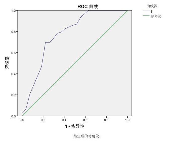 以Δt预测28 d死亡的ROC曲线显示:曲线下面积为0.746(95%CI:0.648~0.844)(P < 0.01),见图 1;以Fbg预测28 d生存的ROC曲线显示:曲线下面积为0.735(95%CI:0.630~0.832)(P < 0.01),见图 2。
