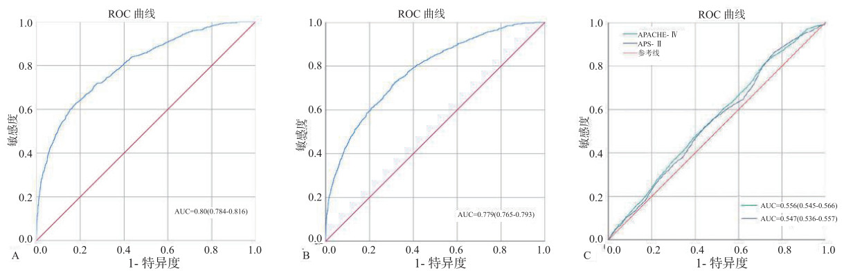 | A为预测ICU病死率,纳入变量: 年龄、BMI、APACHE-Ⅳ、APS-Ⅱ、合并症、入院诊断、机械通气、血管活性药物应用; B为预测在院病死率,纳入变量: 年龄、BMI、APACHE-Ⅳ、APS-Ⅱ、合并症、入院诊断、机械通气、血液净化、血管活性药物应用; C为用APACH-Ⅳ、APS-Ⅱ预测在院病死率 图 1 多变量ROC曲线预测心源性休克患者ICU病死率与在院病死率 Fig 1 The prediction of multivariate ROC curve on the mortality of ICU or hospital |