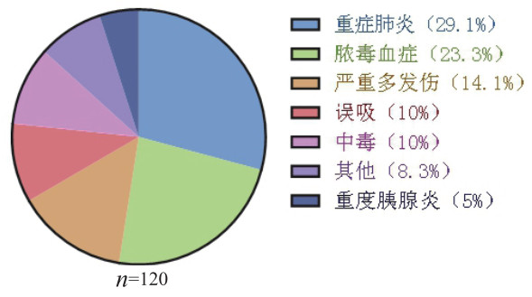 2 结果 2.1 患者一般情况研究期间泰州市人民医院重症医学科共收治接受有创机械通气的ARDS患者144名,其中符合排除标准而排除的患者22名,最终纳入本研究者共120名。120例患者年龄(64.26±17.52)岁,其中男性患者77名(占比64.2%),49例患者有吸烟史(占比40.8%)。常见的基础疾病有高血压(45%)糖尿病(14.2%)冠心病(8.3%)脑血管病(9.2%)以及近半年手术史(10%)。对发生ARDS的病因分析,最常见为重症肺炎(29.1%),此外还有脓毒血症(23.3%), 严重多发伤(14.1%), 误吸(10%), 中毒(10%)和重症胰腺炎(5%)见图 1。