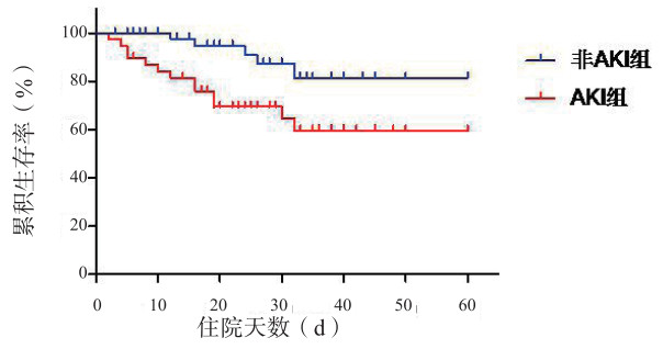 图 2 AKI与非AKI患者Kalpan-Meier生存曲线 Fig 2 Kaplan-Meier survival curve of patients in the AKI and non-AKI groups |