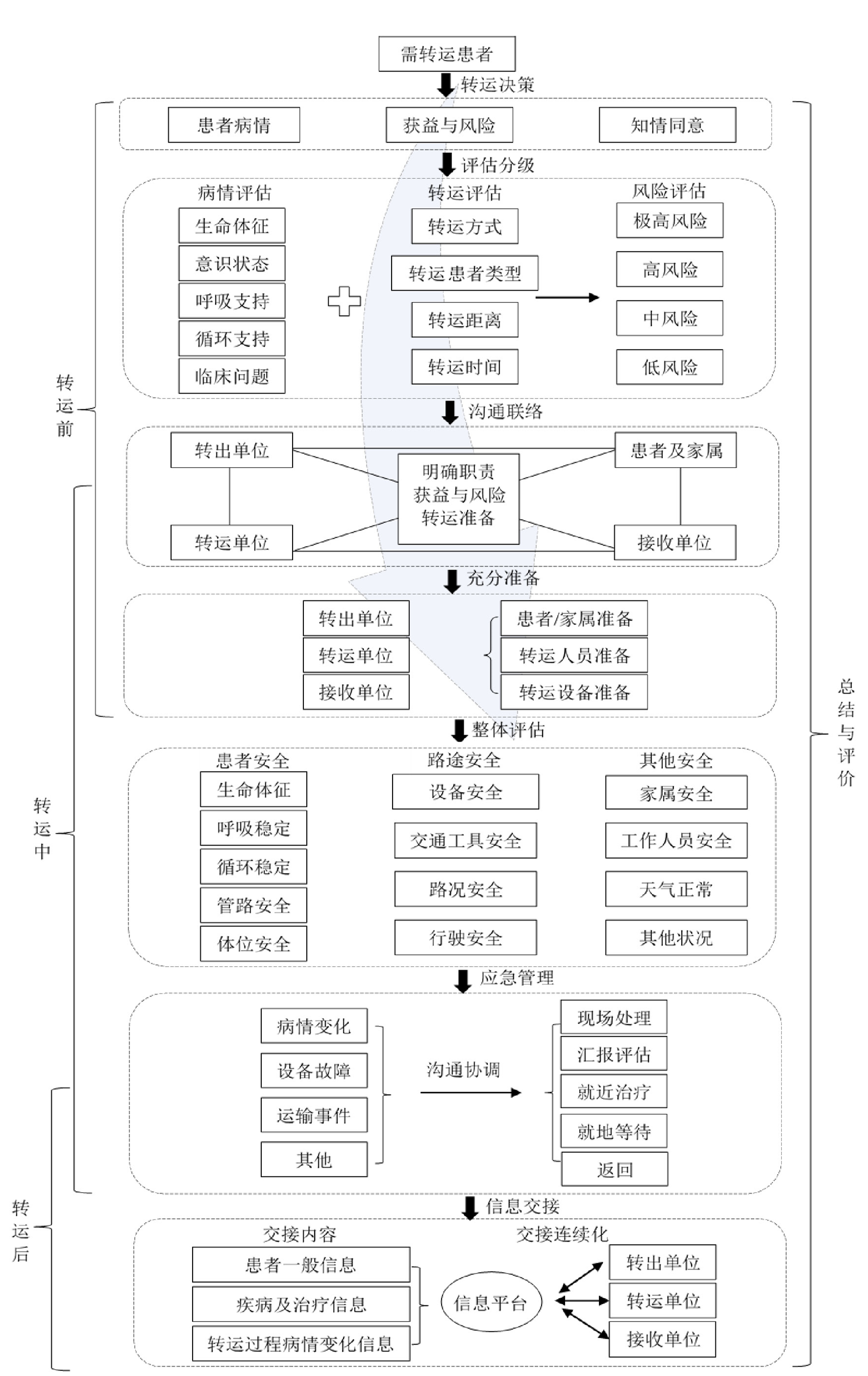 随着医联体建设的不断完善,双向转诊、上下联动分级诊疗模式广泛开展,危重症患者的院际转运频次明显增加[1]。院际转运是危重症患者管理的重要内容,约50% 的危重症患者会经历院际转运[2]。危重症患者院际转运不良事件发生率约为12.5%~62%[3]。经历院际转运危重症患者的死亡比例比普通危重症患者高4%~8%[2, 4]。如何保障危重症患者的院际转运安全,促进患者在不同医疗单位治疗的连续性,成为当前亟需关注的问题。2003年澳大利亚发布《危重症患者院内转运最低标准》 [5],2004年美国发布《危重症患者院际和院内转运指南》 [6],2010年我国发布《中国重症患者转运指南(2010)》(草案)[7],2011年英国发布《危重症患者转运指南(2011)第3版》[8],上述危重症患者转运指南对院内和院际转运工作给予了综合性的指导建议。目前院内转运工作趋于成熟[9],院际转运工作中的转运决策、转运风险评估分级、人员及设备配置、患者信息交接的连续性等关键问题需继续探究。
